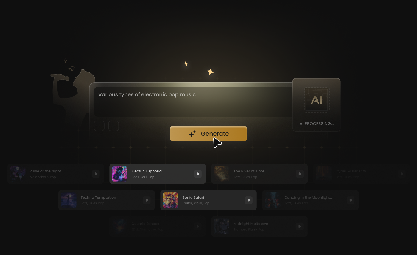 From pop to classical, electronic to jazz, our AI music generator empowers you to create songs in a variety of genres and moods. No matter where your inspiration comes from, you'll find the perfect style to make your music stand out and captivate your audience.